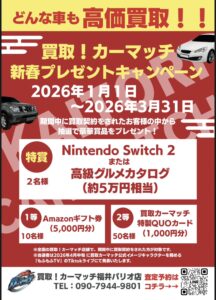 福井県全域、福井市、鯖江市、越前市で車の売却をご検討中の皆さまへ、今だけの特別キャンペーンのお知らせです。現在カーマッチでは、新春限定の買取プレゼントキャンペーンを開催中ですが、いよいよ終了まであと1か月となりました。通常の高価買取に加えて豪華賞品が当たるため、売るなら今がいちばんお得なタイミングです。