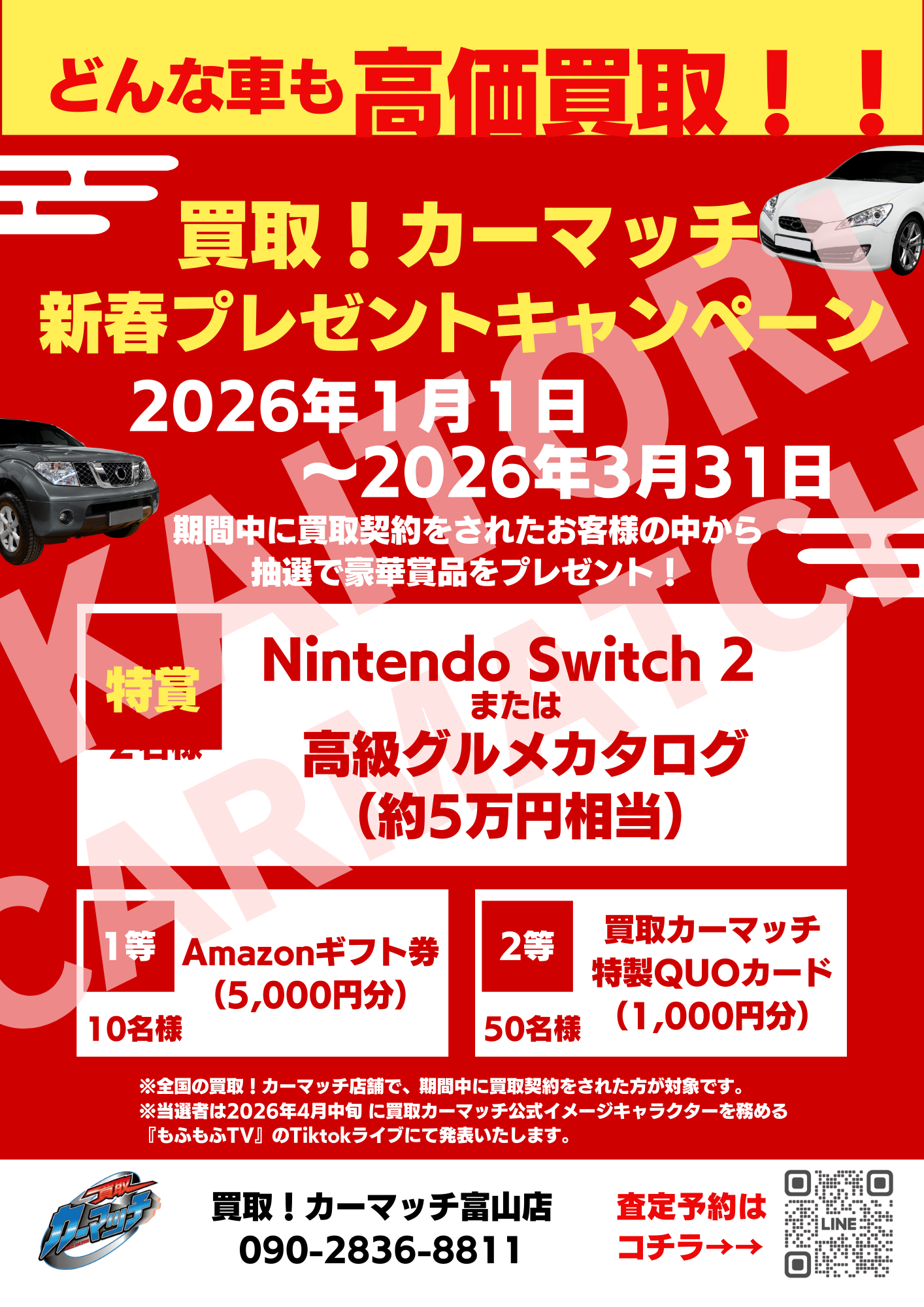 2026年1月1日から3月31日までの期間中に、全国の「買取!カーマッチ」各店にて買取契約をされたお客様の中から、豪華賞品が抽選で当たる 特別企画を実施します!